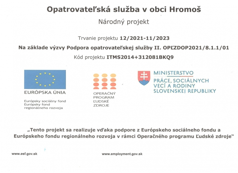 - Cieľom projektu je zabezpečiť dostupnosť domácej opatrovateľskej služby za účelom predchádzania umiestňovania klientov do pobytových zariadení. Projekt taktiež prispeje k udržaniu a dokonca k rozšíreniu zamestnanosti v obci. Pri realizácii projektu bude žiadateľ využívať vlastné personálne, materiálne, priestorové a technické zabezpečenie. Cieľovou skupinou budú občania obce/ klienti, ktorým bude poskytovaná opatrovateľská služba v domácom prostredí a opatrovateľky, ktoré budú opatrovateľskú službu zabezpečovať.
